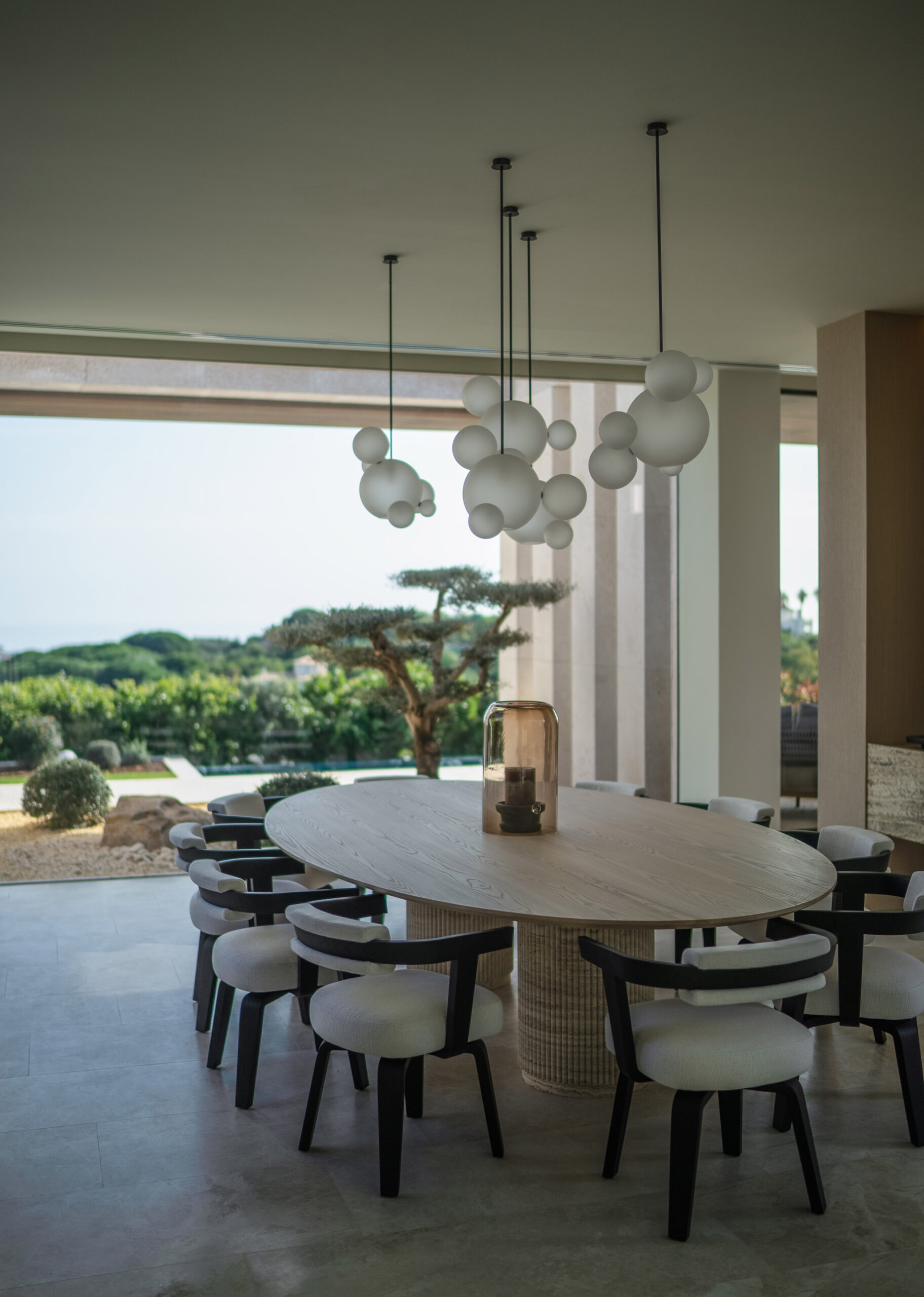 In the TV room, the Cleo sofa by Vincent Van Duysen invites moments of leisure, while the home office is outfitted with the Barbican chair, Piccadilly chair and stool by Rodolfo Dordoni, and the Graduate bookcase by Jean Nouvel, ensuring a workspace that is both functional and stylish. The villa’s spa area continues the theme of relaxation, featuring the Sway outdoor sofa by Yabu Pushelberg and the Greenpoint outdoor chair by Vincent Van Duysen.