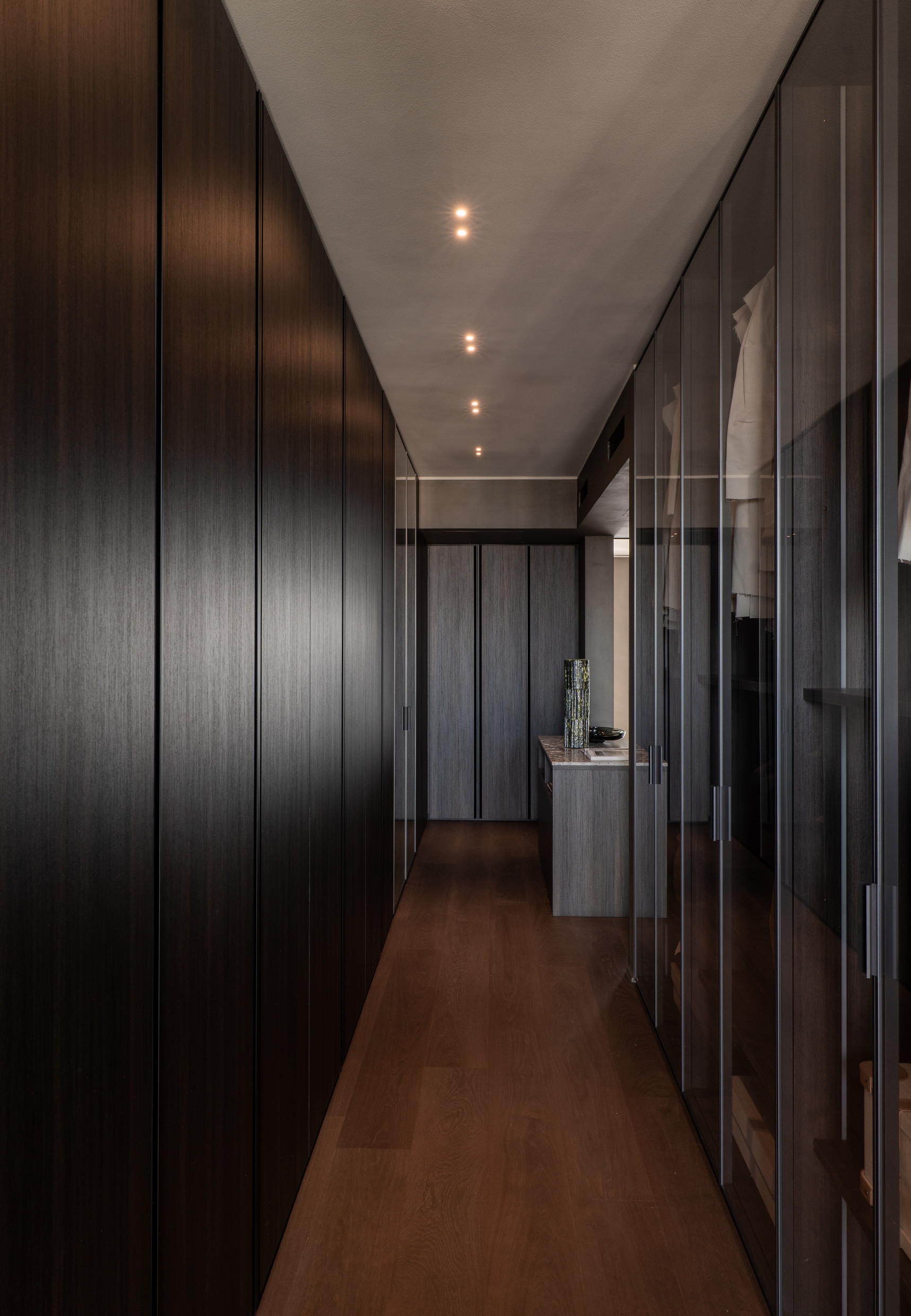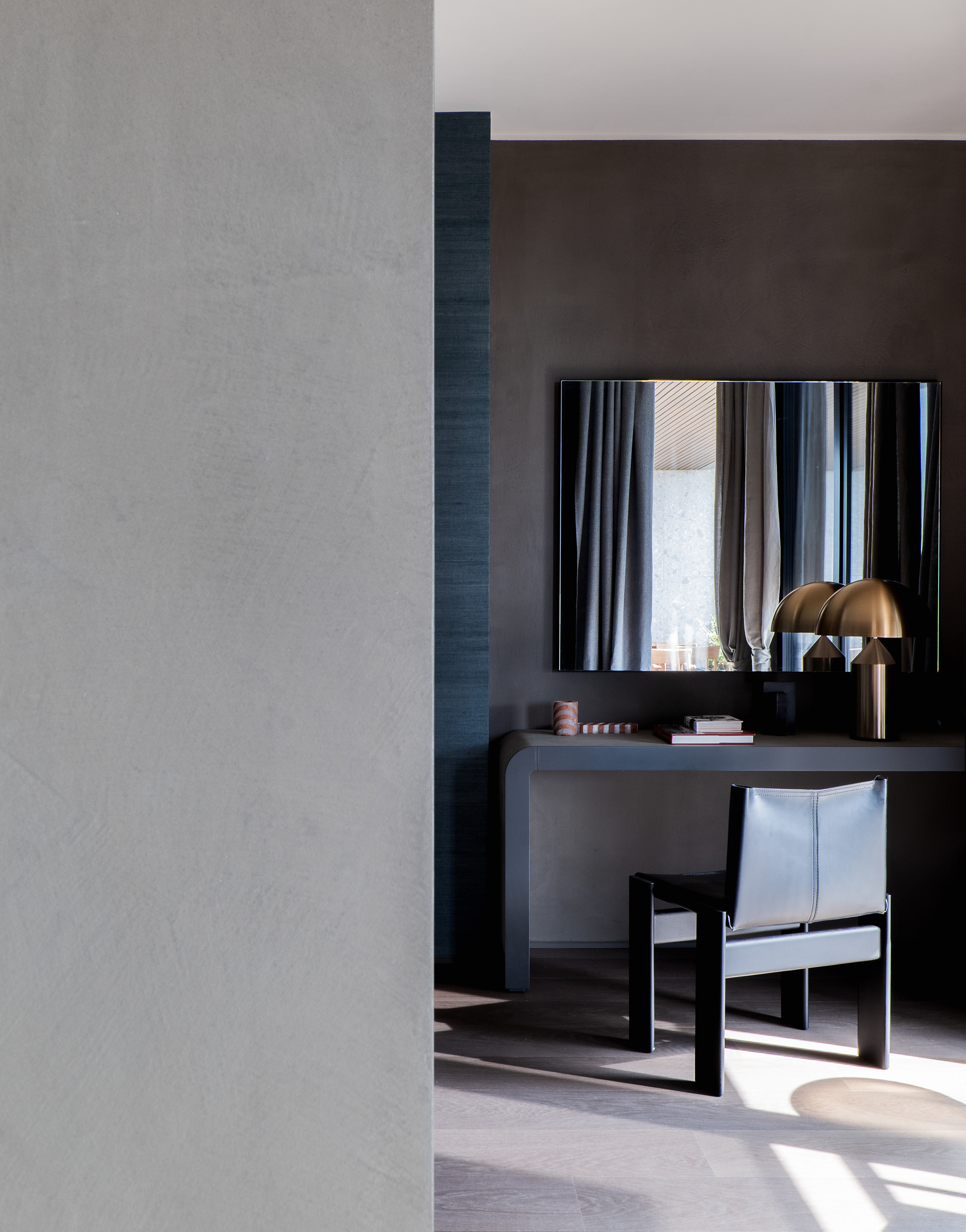 In the master bedroom, the Anton bed by Vincent Van Duysen is accompanied by Van Duysen’s Aster small table and Paula armchair. The elegant simplicity of the Monk chair by Tobia Scarpa completes the bedroom’s sophisticated aesthetic as the Gliss Master system by Vincent Van Duysen elevates the wardrobe.