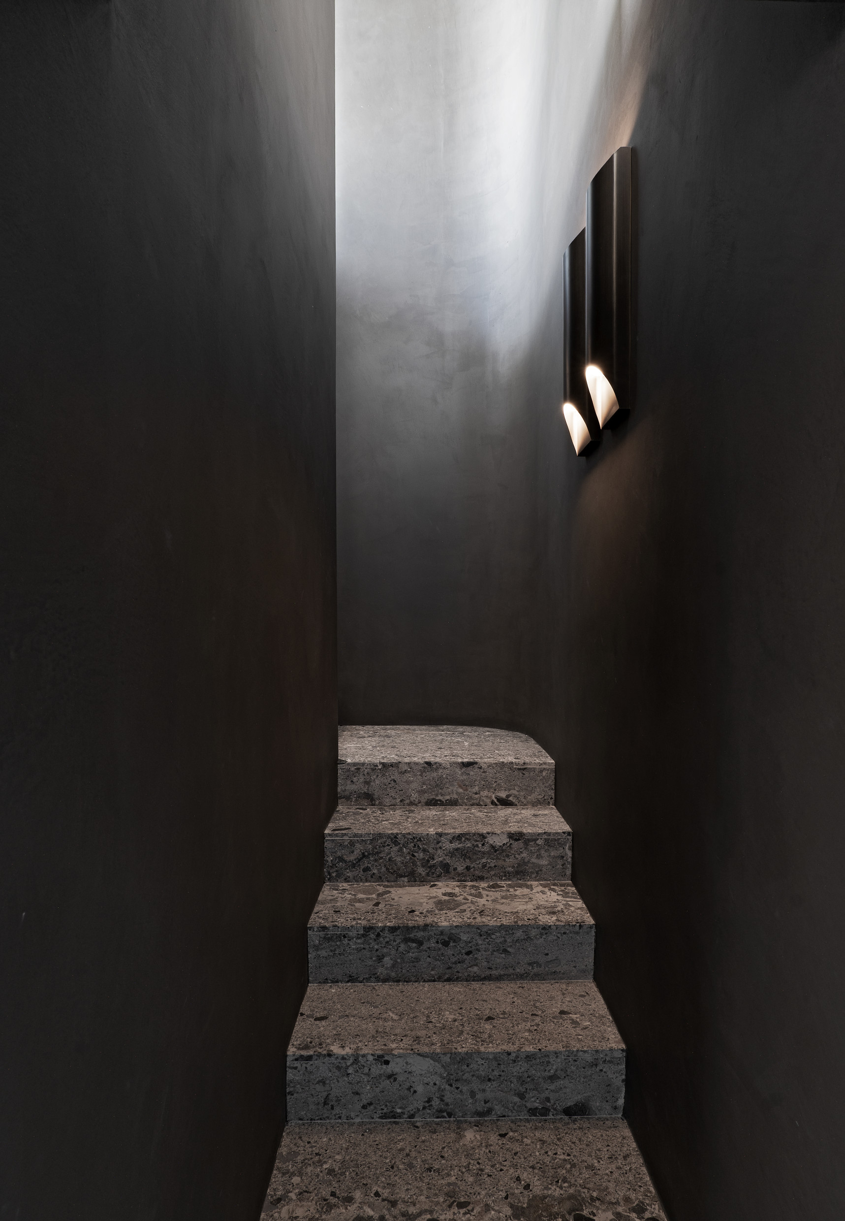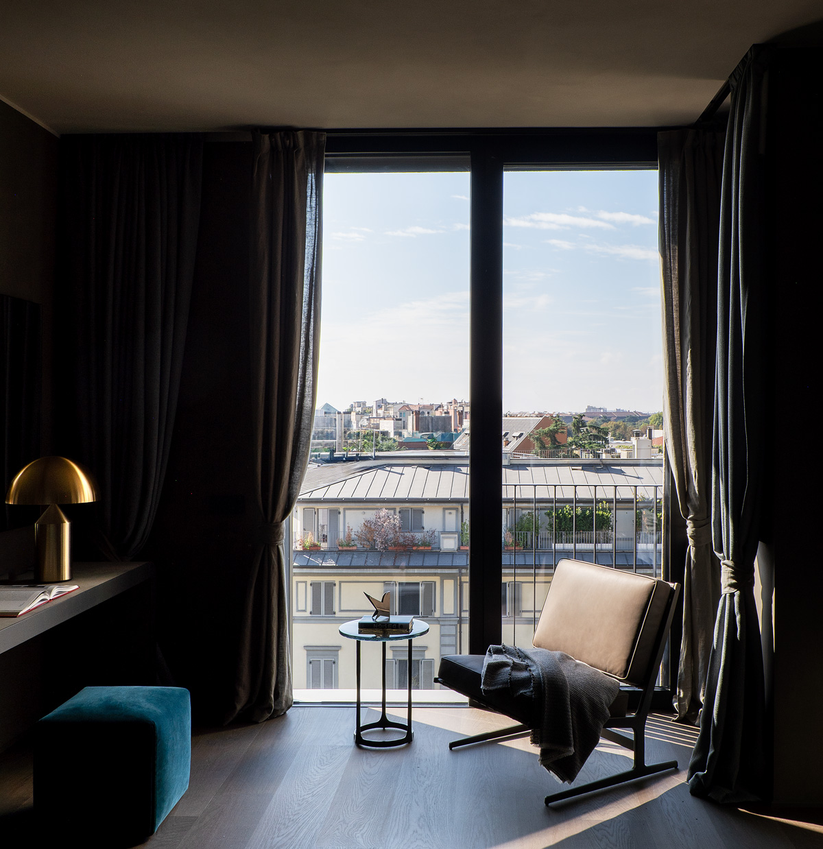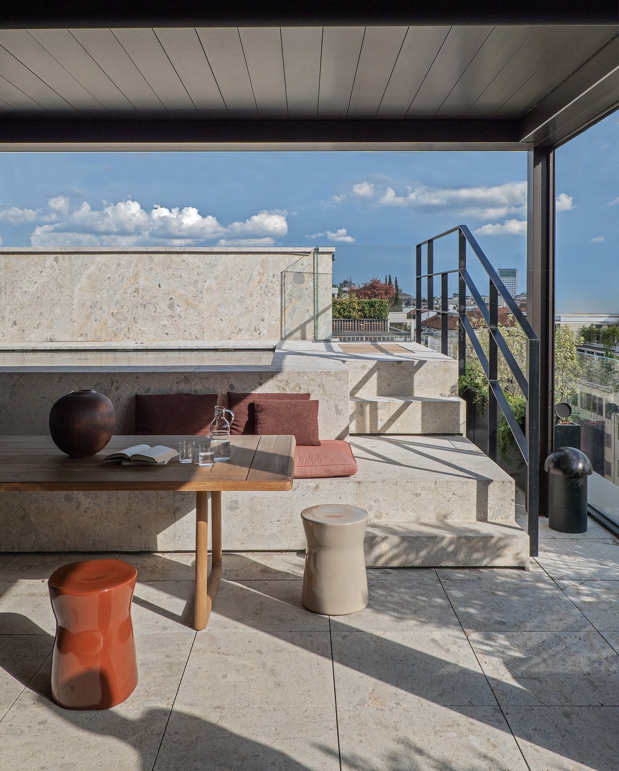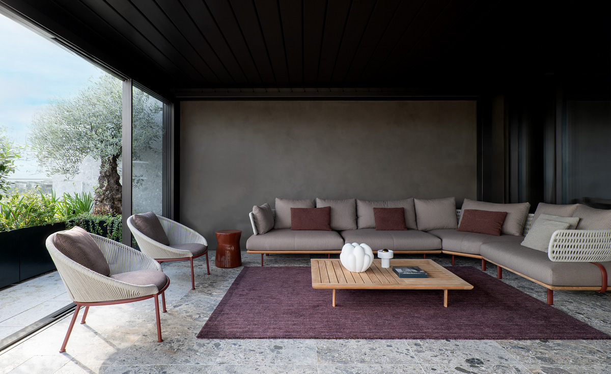 Outdoors, the Sway sofa and small tables by Yabu Pushelberg join the Petalo armchair, Fairmount table, and Picea small tables — all by Vincent Van Duysen — to create a space for peaceful relaxation and reflection under the shaded terrace overlooking Milan’s picturesque rooftops.